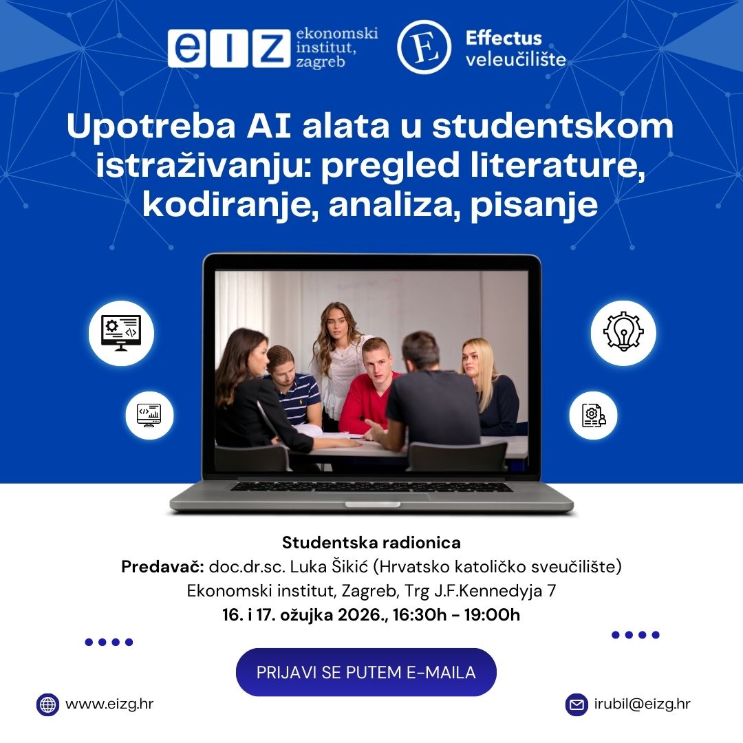 Ekonomski institut Zagreb organizira dvodnevnu studentsku radionicu s nazivom „Upotreba AI alata u studentskom istraživanju: pregled literature, kodiranje, analiza, pisanje“, koja će se održati 16. i 17. ožujka 2026. godine od 16:30 do 19:00 sati u prostorima Instituta (Trg J. F. Kennedyja 7).