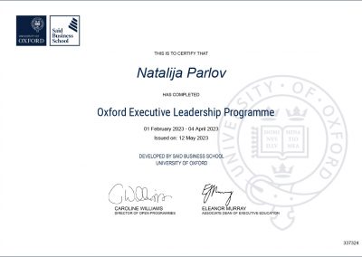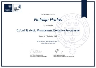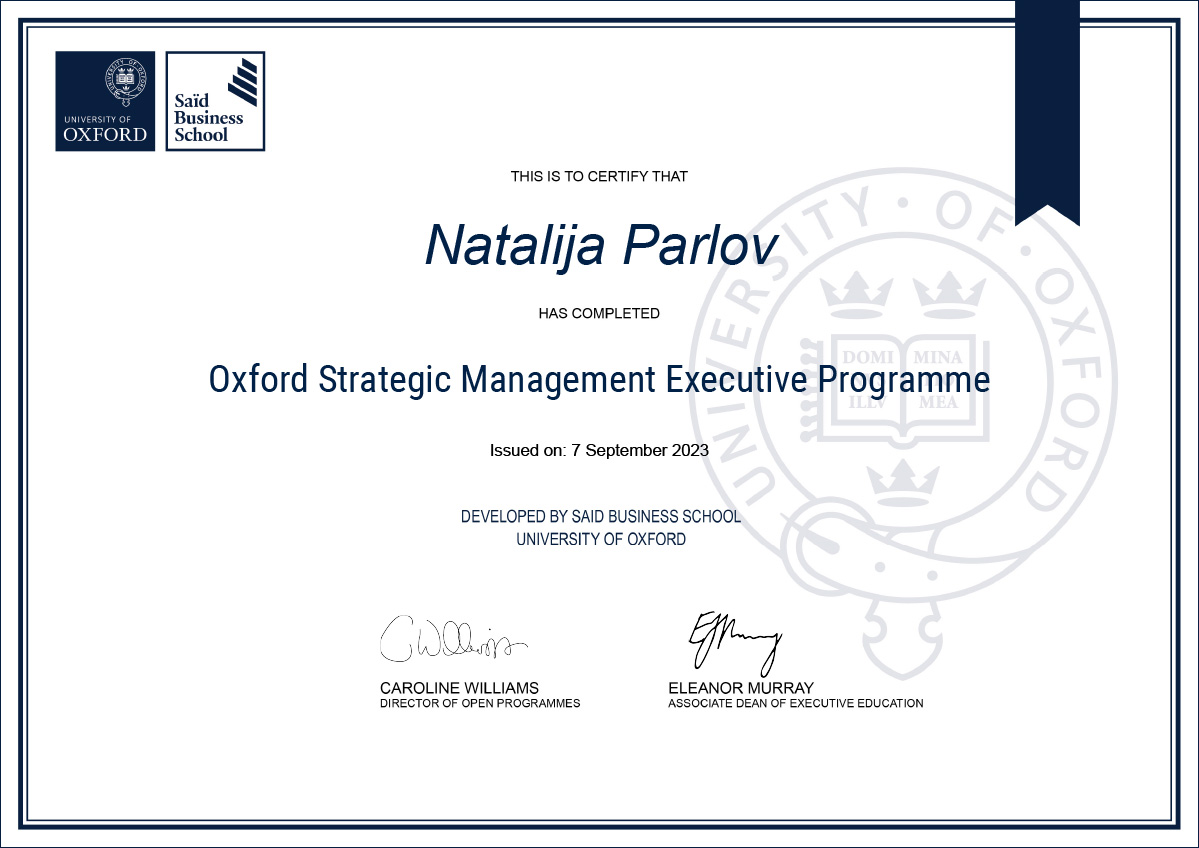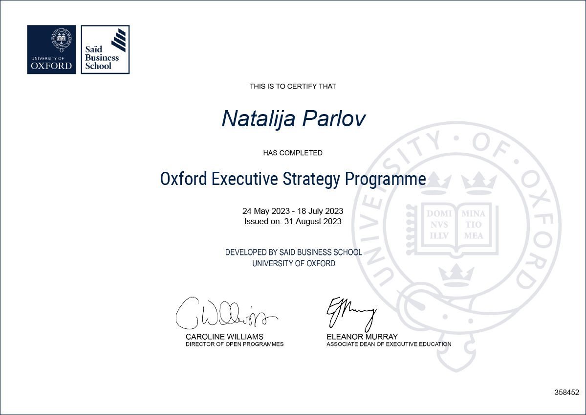 Na jednoj od najboljih svjetskih poslovnih škola „Saïd Business School“ na Sveučilištu Oxford, predavačica Effectus veleučilišta dr. sc. Natalija Parlov Una, ujedno i članica Nadzornog odbora OTP Banke d.d., uspješno je završila intenzivni polugodišnji program „Strateškog menadžmenta“.