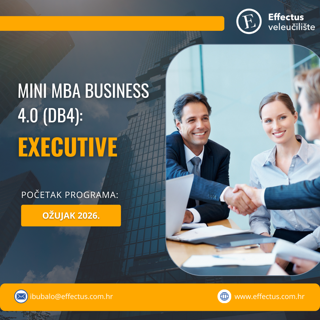 EFFECTUS veleučilište objavljuje javni poziv za upis na novi program cjeloživotnog obrazovanja „Mini MBA Business 4.0 (DB4): Executive“. Ovaj program namijenjen je najvišim razinama menadžmenta te omogućuje razvoj i unaprjeđenje ključnih kompetencija za uspješno poslovno vođenje i donošenje strateških odluka u izazovnom poslovnom okruženju.