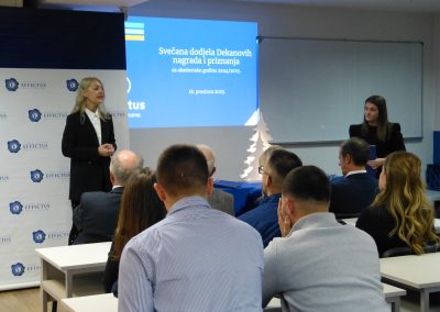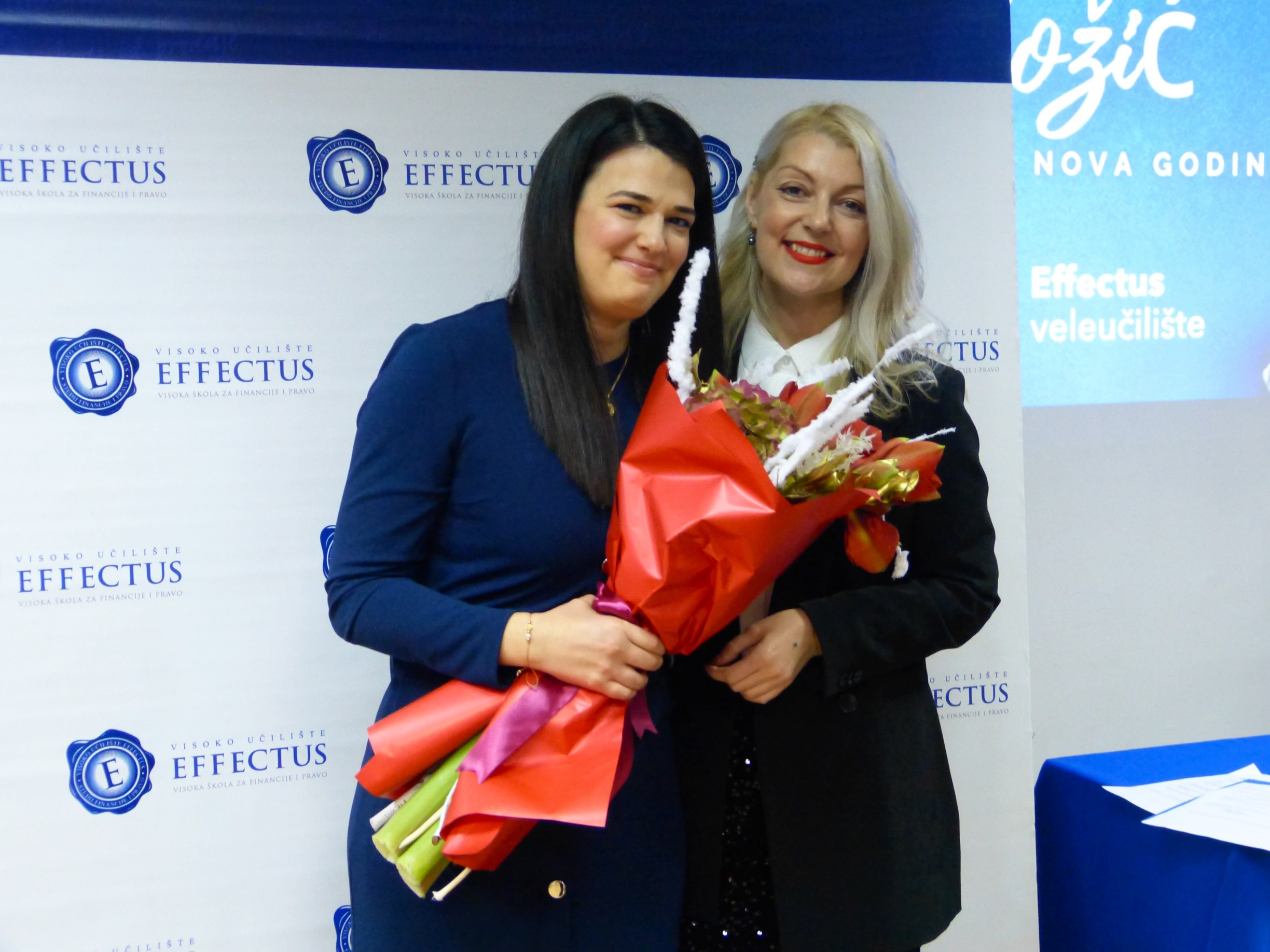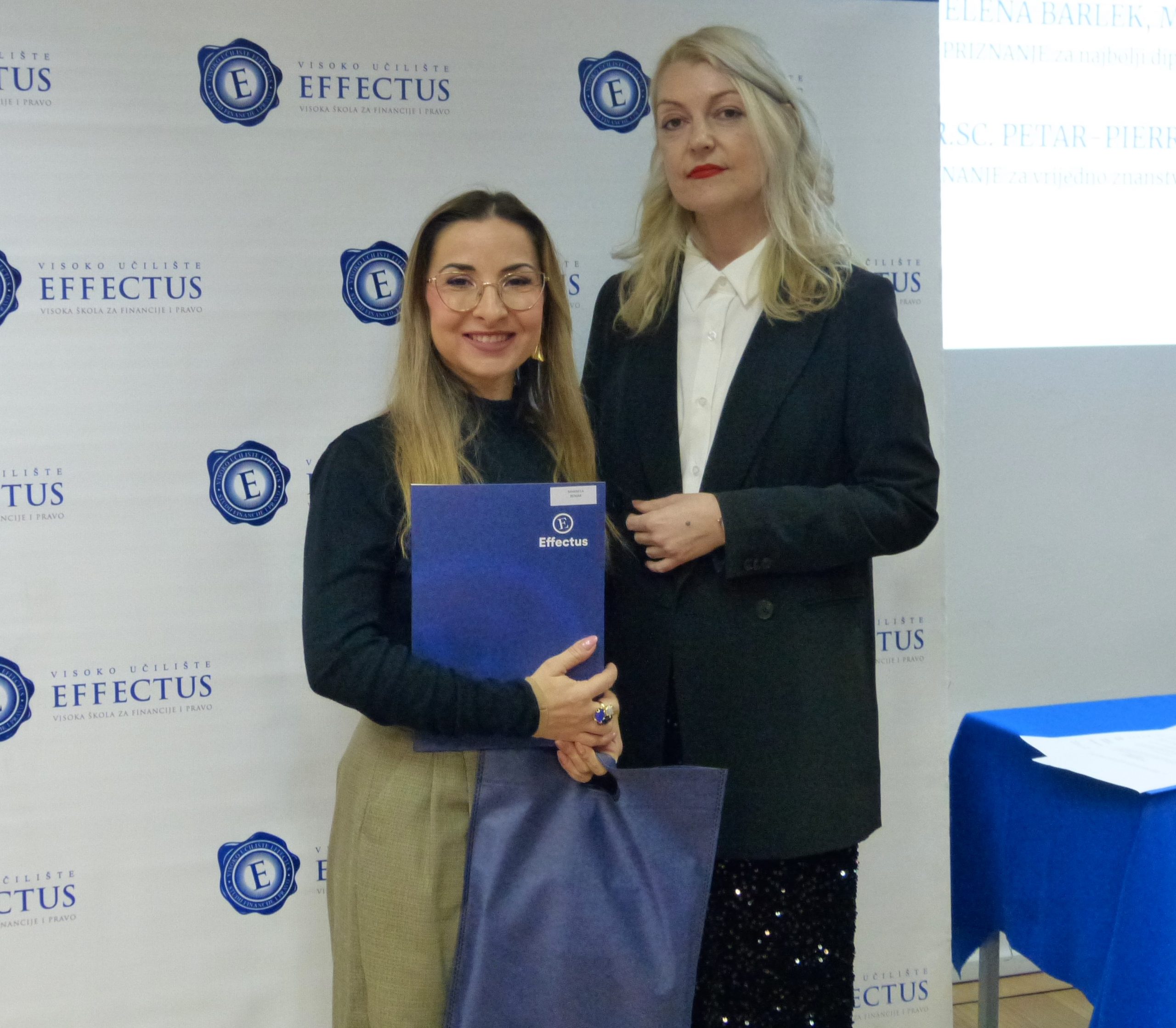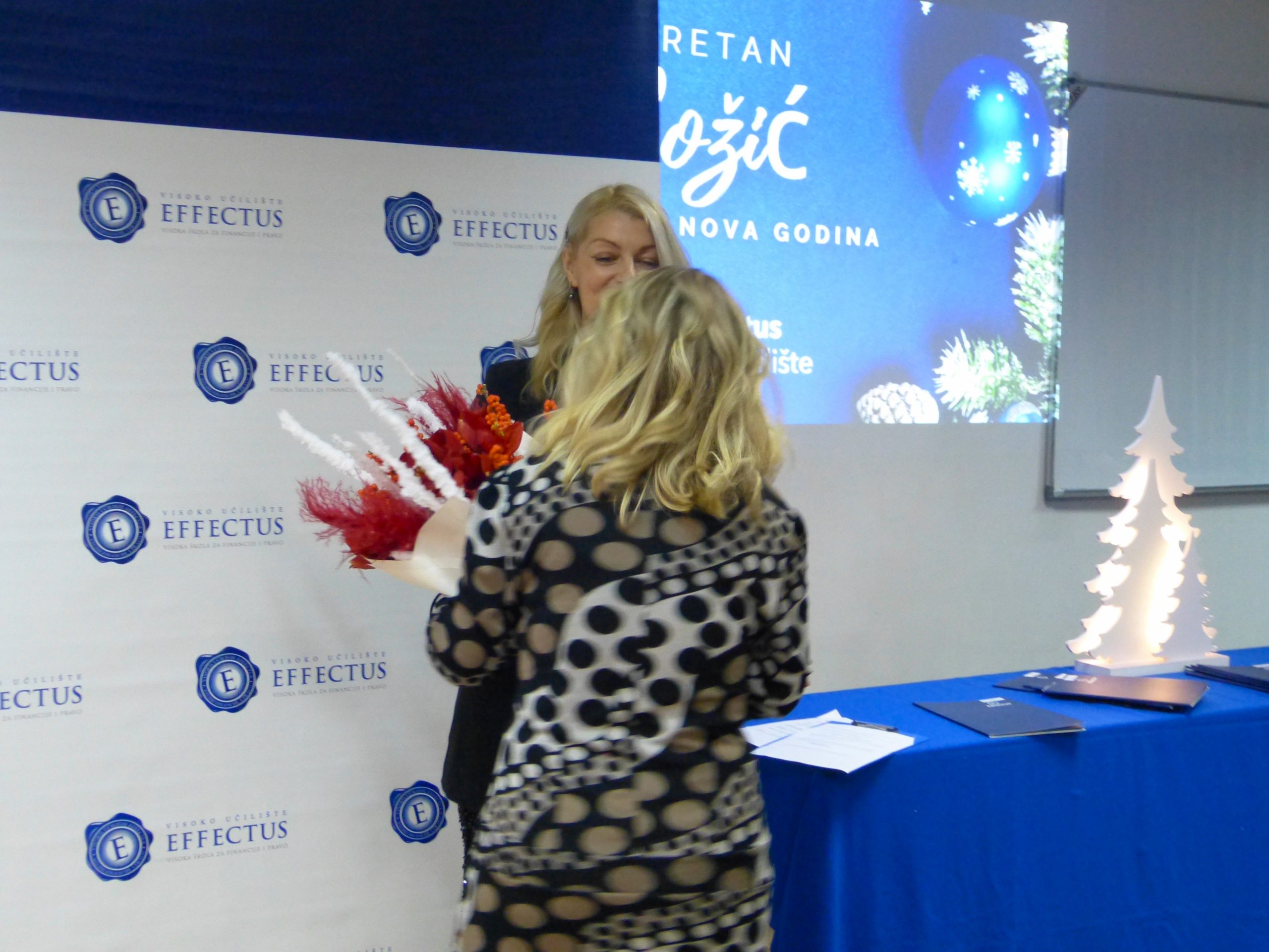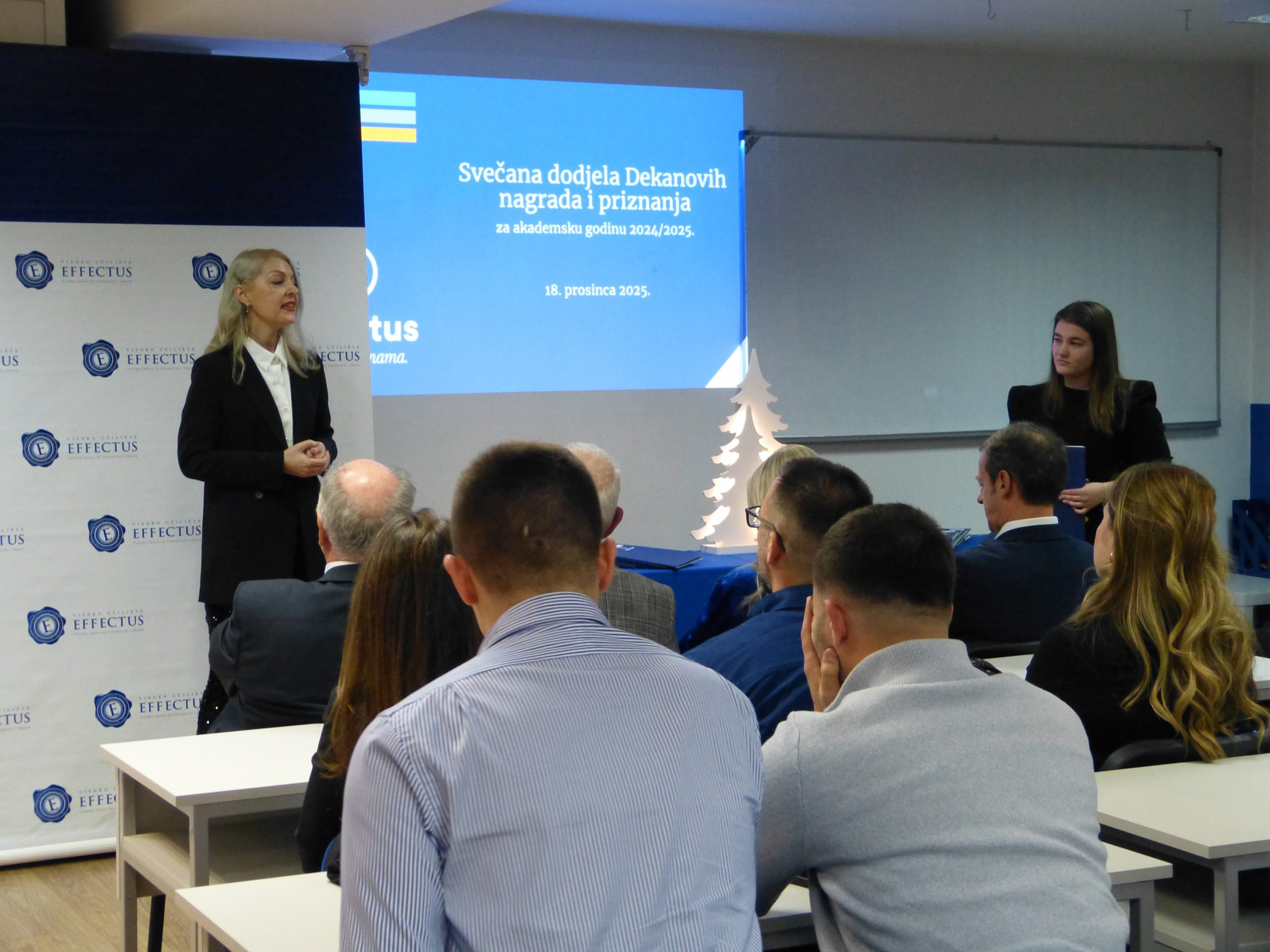 U predblagdanskoj atmosferi zajedništva i ponosa, 18. prosinca na EFFECTUS veleučilištu održana je svečana dodjela Dekanovih nagrada i priznanja, na kojoj su proglašeni najuspješniji studenti, djelatnici i institucije. Ovo događanje nije bilo samo formalno priznanje izvrsnosti, već i istinski emotivan trenutak ispunjen iznenađenjima koja su duboko dirnula srca svih prisutnih. Prema riječima dekanice dr. sc. Jelene Uzelac priznanja simbol su naše zajedničke predanosti i dokaz da trud i strast prema znanju uvijek donose plodove. „Svaki pojedinac i svaka institucija ovdje večeras su svjetionici koji vode našu akademsku zajednicu prema svjetlijoj budućnosti”, kazala je dekanica Uzelac.