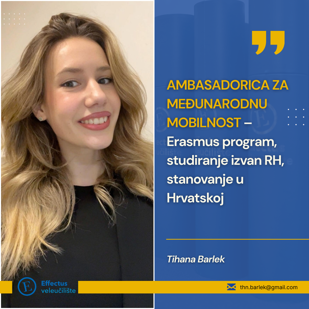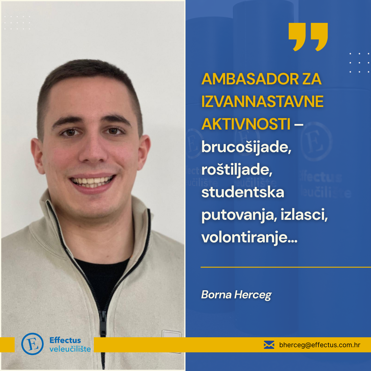 EFFECTUS veleučilište s ponosom predstavlja nove ambasadore koji će studentima pružati podršku i informacije iz različitih područja studija i studentskog života. Njihova je zadaća olakšati snalaženje u akademskom i društvenom okruženju te omogućiti kvalitetnije iskustvo studiranja.