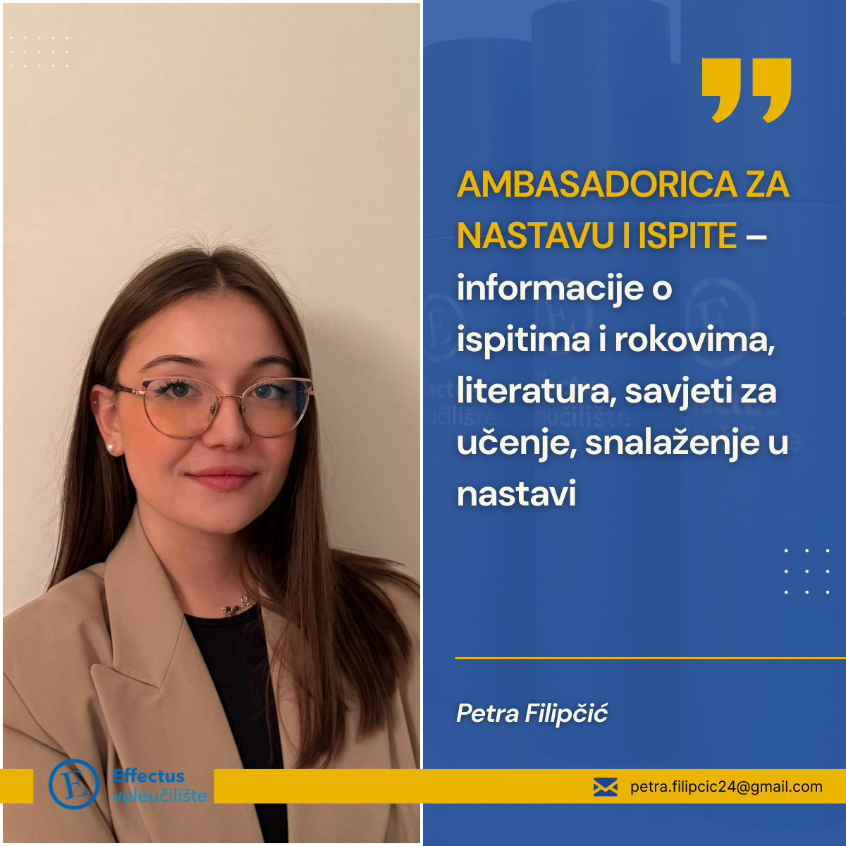 Petra je ambasadorica zadužena za pitanja vezana uz nastavu, ispite i literaturu. Svojim iskustvom pomaže studentima da se bolje organiziraju, učinkovitije uče i maksimalno iskoriste predavanja i dostupne materijale. Ističe kako je Effectus mjesto gdje se teorijsko znanje povezuje s praksom, a jasna struktura nastave olakšava akademski put.