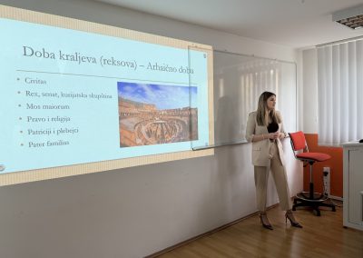 Predavanje je proteklo u iznimno ugodnoj i poticajnoj atmosferi, obilježeno je interaktivnim pristupom i aktivnim sudjelovanjem studenata. Već u uvodnom dijelu, kroz legende o nastanku Rima, otvoren je zanimljiv pogled na razvoj rimskog društva i pravnog sustava, čime je postavljen čvrst temelj za daljnju razradu teme.