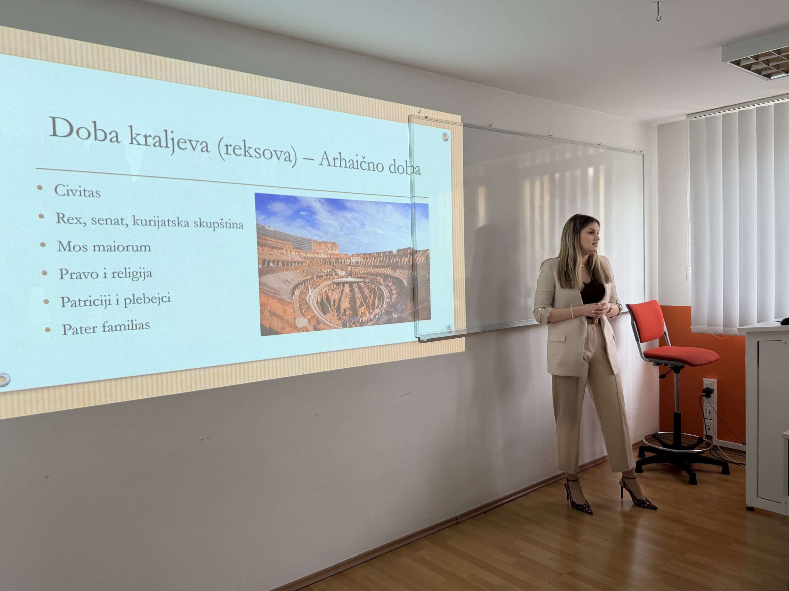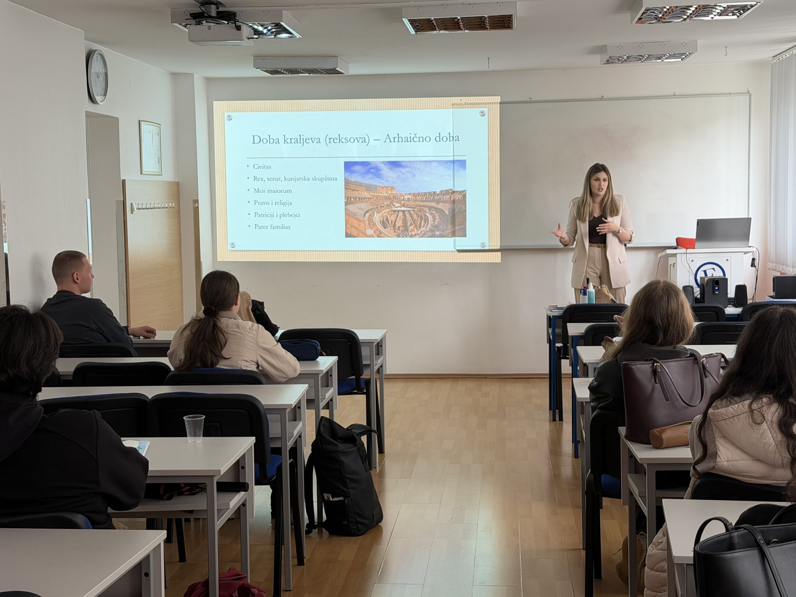Kroz pregled periodizacije rimske povijesti, studentima su približene ključne društvene i pravne promjene koje su oblikovale rimsko pravo. Poseban interes izazvala je rasprava o Gajevoj tripartitnoj podjeli prava, čiji se utjecaj i danas prepoznaje u suvremenim pravnim sustavima. Dinamična razmjena mišljenja i pitanja dodatno je obogatila predavanje i potaknula kritičko razmišljanje.