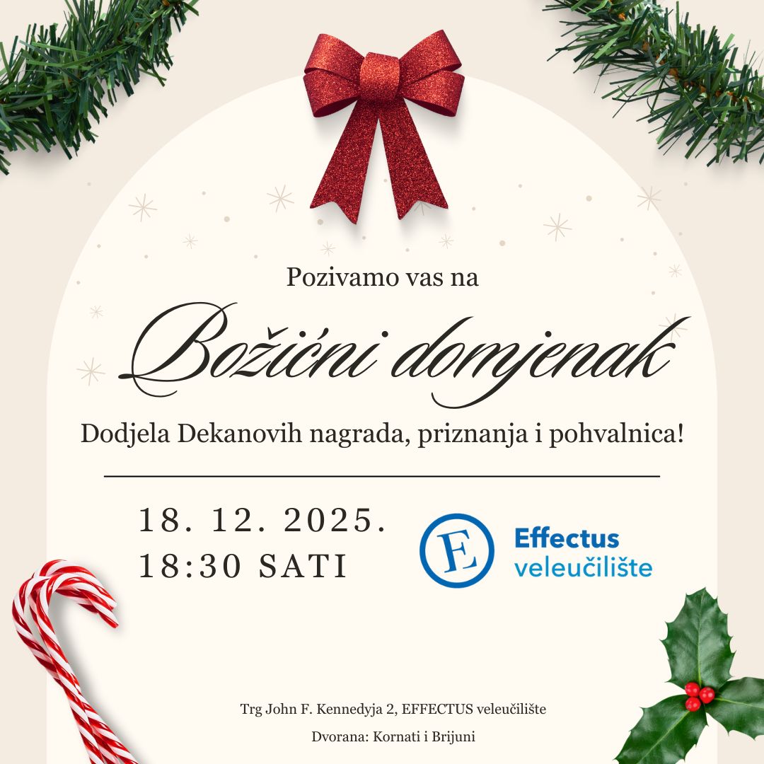 Svečana, tradicionalna dodjela Dekanovih nagrada i priznanja za najbolje studente i zaposlenike EFFECTUS veleučilišta održat će se 18. prosinca 2025. u 18:30 sati, u dvoranama Kornati i Brijuni na EFFECTUS veleučilištu.